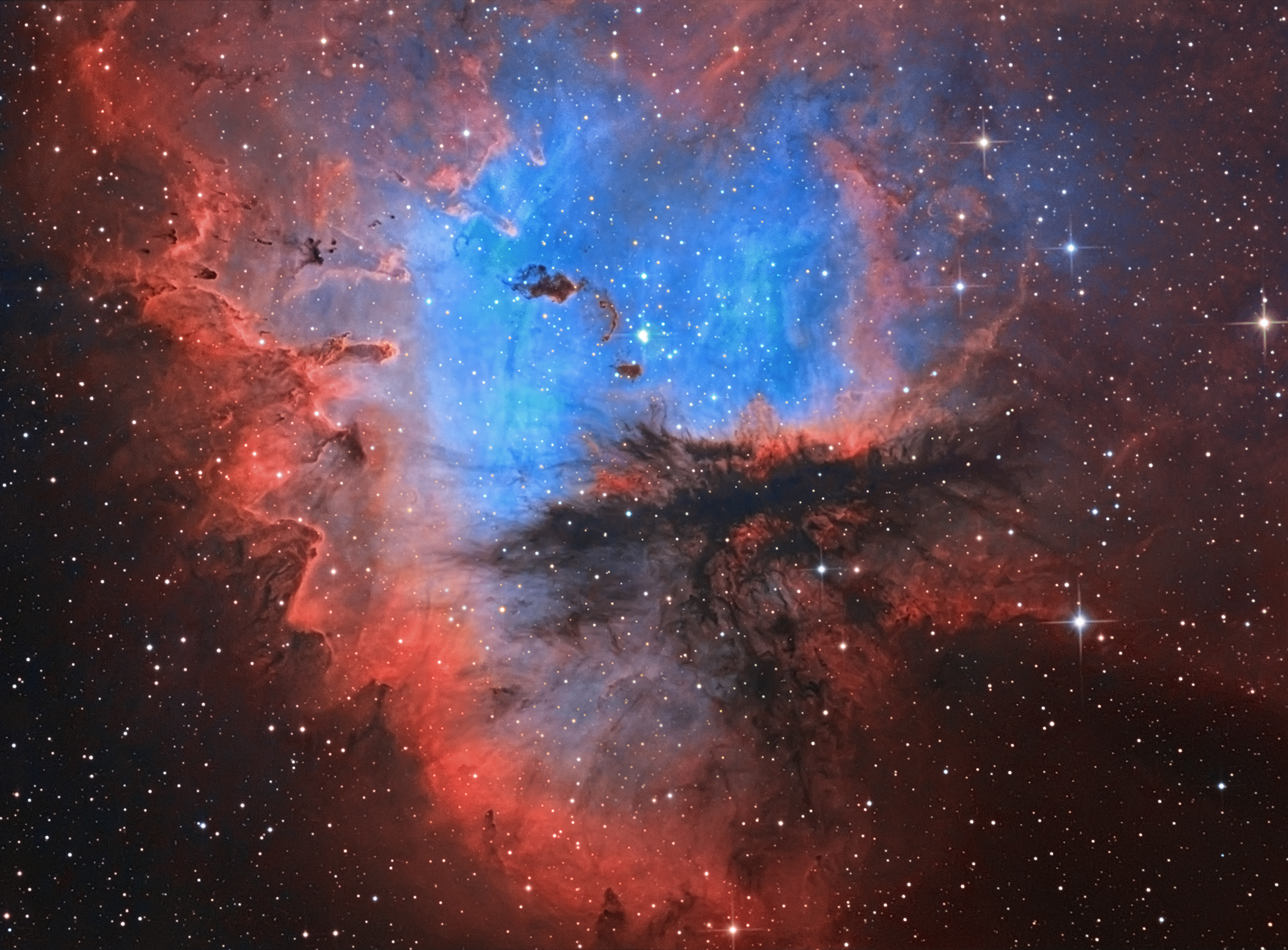 Farbmischung: R = Ha + 33% SII, G = OIII, B = OIII + 33% Ha