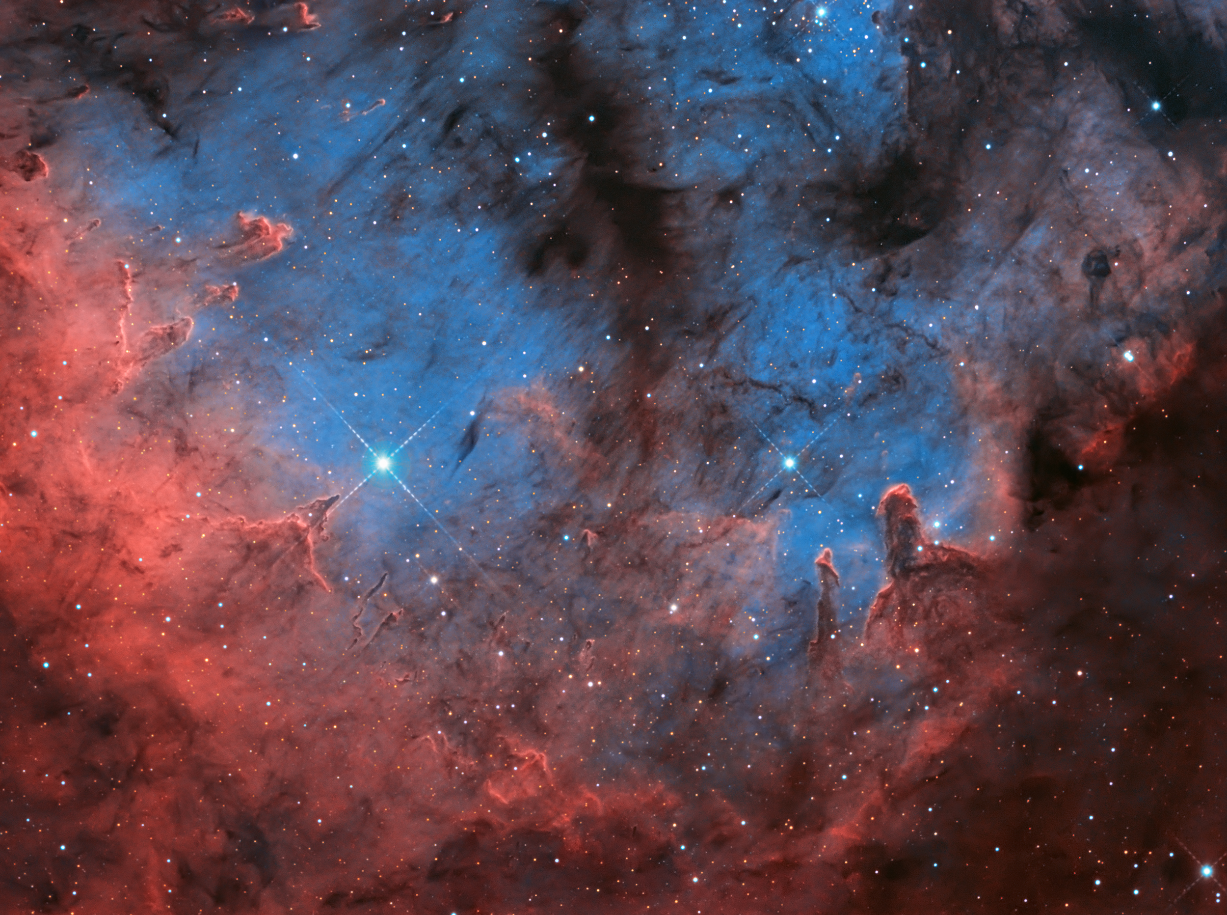 Heiße, junge Sterne und kosmische Säulen aus Gas und Staub scheinen in NGC 7822 hineinzudrängen. Die leuchtende Sternbildungsregion am Rand einer riesigen Molekülwolke im nördlichen Sternbild Kepheus ist etwa 3000 Lichtjahre entfernt. Innerhalb des Nebels sind auf dieser farbenprächtigen Himmelslandschaft helle Ränder und dunkle Formen hervorgehoben. Die Energie für die atomare Emission stammt von der Strahlung der heißen Sterne, deren gewaltige Winde und Strahlung auch die dichteren Säulen formen und erodieren. Im Inneren der Säulen könnten sich durch den gravitativen Kollaps immer noch Sterne bilden, doch wenn die Säulen wegerodiert sind, werden alle sich bildenden Sterne schließlich von ihrem Vorrat an Sternenstaub abgeschnitten. Dieses Feld umfasst in der geschätzten Entfernung von NGC 7822 etwa 40 Lichtjahre.